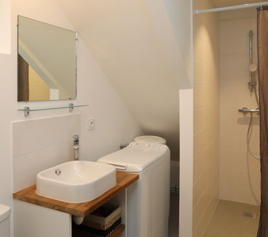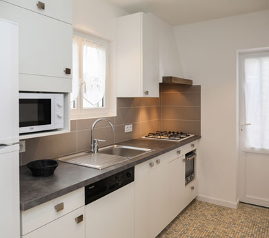 | Disposition : 1 Séjour (TV, fauteuils, table, bibliotheque, 1 canapé-lit 160 x 200), 1 chambre (1 lit 160 x200, 1 lits 80 x 200), 1 cuisine entierement équipée (plaque 4 gaz, hotte, micro-ondes, four, lave-vaisselle, cafetiere, grille pain, autocuiseur, bouilloire, réfrigérateur avec congélateur ...), 1 salle d'eau (avec douche, wc, lave-linge), salon de jardin |